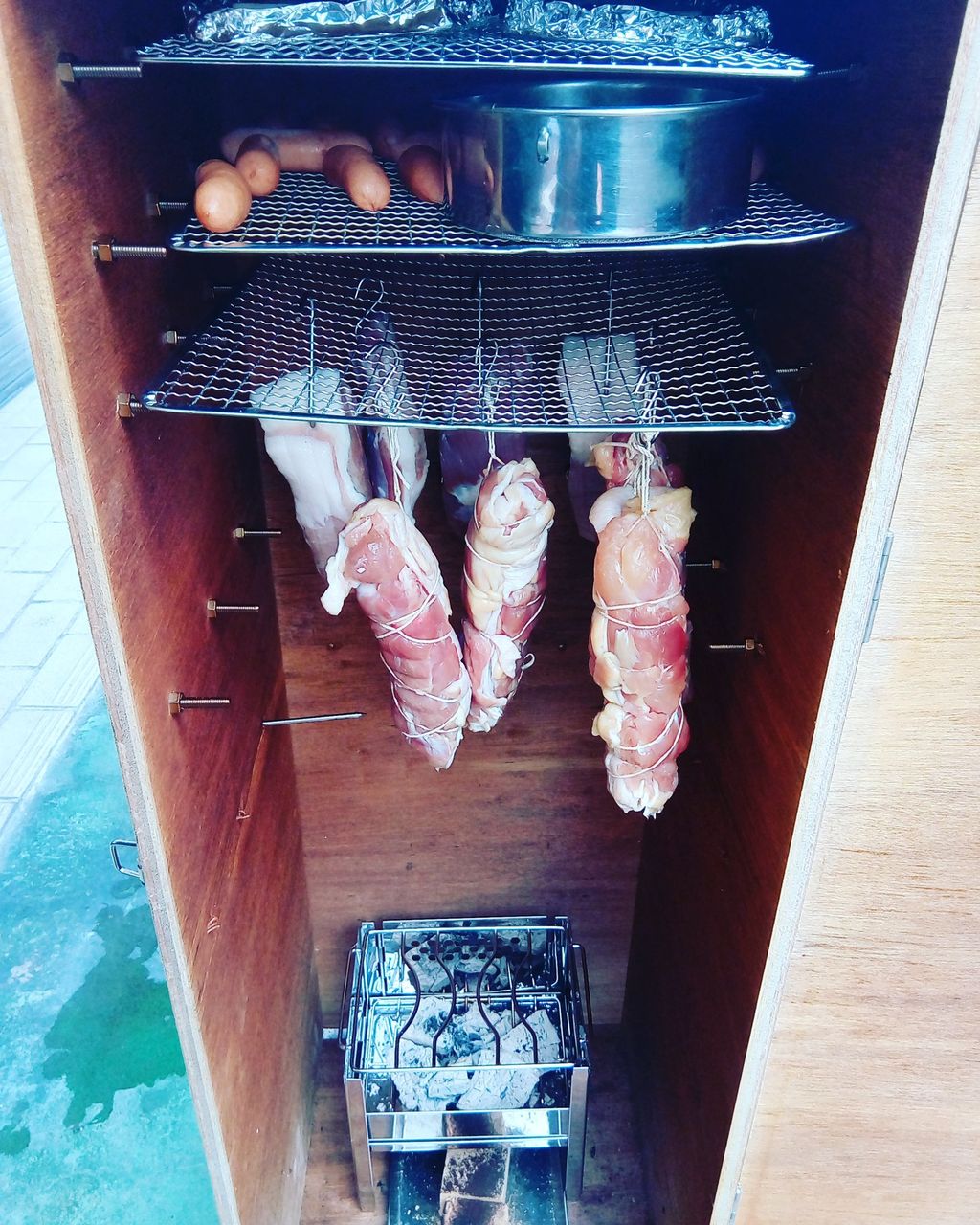 ベーコンの上を滑った生の卵がトースターの加熱部分の着地するで
