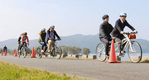サドルとペダルが二つあり、二人乗りできるタンデム自転車の県内公道走行解禁を目指し、県や市町、運輸業者、自転車関連団体などでつくる「滋賀プラス・サイクル推進協議会」が七日、東近江市栗見新田町で実証実験をした。琵琶湖の観光振興に加え、視覚障害者などの生活利便性向上や健康維持に役立つと期待されている。